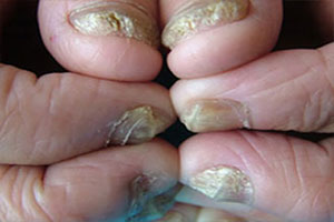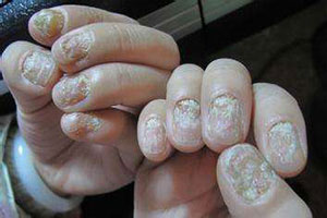2、甲板變脆易碎:真菌侵入甲板和甲床,在角質(zhì)溶解酶的作用下,角質(zhì)蛋白被溶解,形成角質(zhì)細小顆粒,角質(zhì)顆粒呈粉末狀易于脫落、松散而變得碎雜,被破壞的甲板缺乏彈性和韌性而變脆。