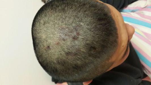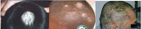 2、黃癬:每個年齡段都有可能會出現(xiàn),但是兒童感染的幾率比較高,典型皮損為盤狀黃豆大小的黃癬痂,中心貫穿有毛發(fā),病發(fā)參差不齊,干枯無光澤,愈后形成萎縮性疤痕,永久性禿發(fā)。