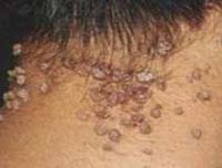 中醫(yī)稱“千日瘡”,俗稱“刺瘊”、“瘊子”等。尋常疣初起為針尖大丘疹,漸增至豌豆大或更大,圓形或多角形,表面粗糙呈刺狀,質(zhì)硬,灰黃、污黃或污褐色,繼續(xù)發(fā)育呈乳頭狀增殖。摩擦或撞擊時(shí)易出血。初發(fā)常為1個(gè),長(zhǎng)期不變或不斷增多,鄰近者互相融合,有時(shí)可自身接種。