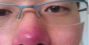 3、鼻贅期:鼻贅期又稱為肥大期,常見于40歲后的男性。病程遷延日久,鼻部皮脂腺和皮膚組織增生肥厚,血管擴張?;颊邥l(fā)現(xiàn)鼻頭明顯增大,高出皮面的分葉狀的、大小不等、高低不平的柔軟結(jié)節(jié),最終導(dǎo)致畸形的鼻贅。