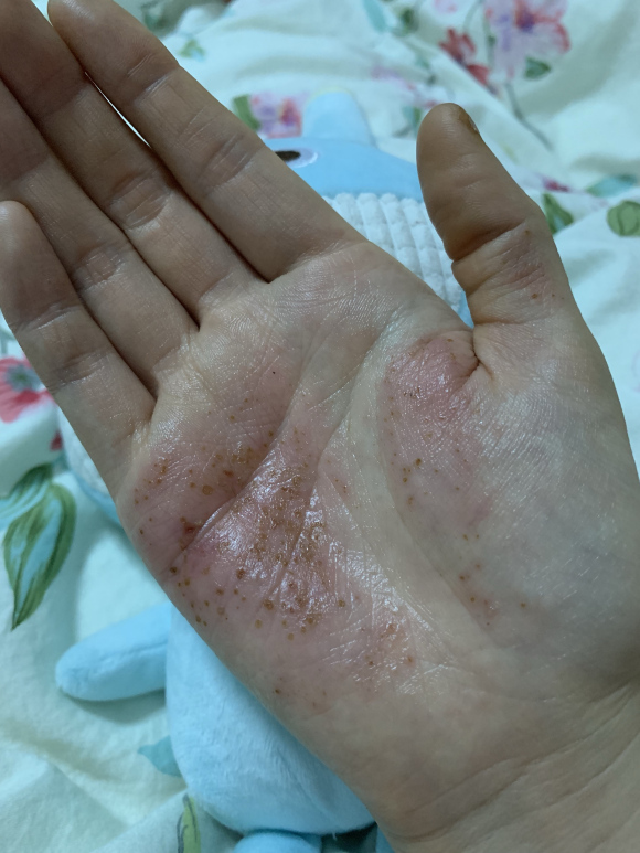 掌跖膿皰病變輕時(shí),皮損局限于手掌足底一側(cè),重時(shí)可以對(duì)稱(chēng)于兩個(gè)手掌,足弓,甚至整個(gè)手掌,足底均會(huì)受累,典型的皮損為掌心,足弓處成批出現(xiàn)針尖帽大小深在性水皰,伴有中度搔癢,水皰逐漸增大,中心出現(xiàn)小黃點(diǎn),外周仍透明,黃點(diǎn)迅速向外擴(kuò)展形成膿皰,經(jīng)過(guò)5-7天,膿皰吸收、表皮增厚、脫落,其下可見(jiàn)紅色嫩薄的表皮,以及紅嫩的表皮下方有水皰、膿皰,如此反復(fù)發(fā)作,遷延不愈。病情嚴(yán)重時(shí)可有糜爛、滲液或皸裂、疼痛,給病人帶來(lái)極大的痛苦。