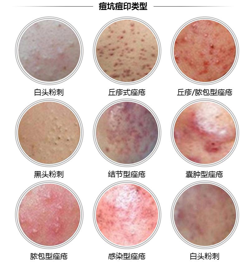痤瘡俗稱“青春痘”,又叫“面皰”“粉刺”“酒刺”“暗瘡”等,是由于毛囊及皮脂腺阻塞,發(fā)炎所引發(fā)的一種慢性炎癥性皮膚病。通常好發(fā)于面部、頸部、胸背部、肩膀和上臂。臨床以白頭粉刺、黑頭粉刺、炎性丘疹、膿皰、結(jié)節(jié)、囊腫等為主要表現(xiàn)。這種疾病青春期多見,但也不完全受年齡階段的限制,從兒童到成人,幾乎所有年齡段的人都可以發(fā)病。如果你懷疑自己得了痤瘡,可以對照下面譜圖;如果你還是不能確定,可以聯(lián)系我們,幫你診斷病情。