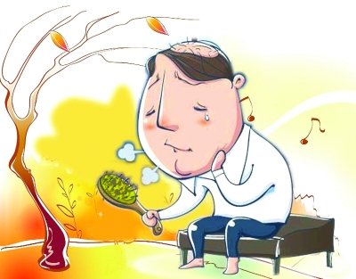 按摩:晚上臨睡前用梳子將頭發(fā)梳三十下,這樣既可促進頭皮的血液循環(huán),又能將頭發(fā)上黏附的塵垢梳掉,有利于生發(fā)、固發(fā)和增加頭發(fā)的光澤?;蛘呷矸潘桑p手握空心拳,先深呼吸兩次,然后雙手舉拳置于前額,由中心起。向左右兩邊輕拍,一直敲至前額兩側,來回二十次。