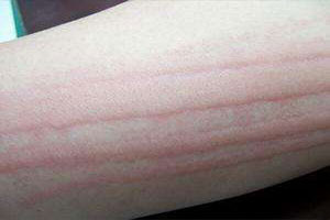 1、皮膚劃痕蕁麻疹:又稱人工性蕁麻疹。表現(xiàn)為用手搔或用鈍器劃過皮膚后,沿劃痕出現(xiàn)條狀隆起,伴瘙癢,不久后可自行消退。皮膚劃痕癥可持續(xù)數(shù)周、數(shù)月至數(shù)年。