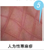 人工性蕁麻疹:用指甲或鈍器劃皮膚時,即發(fā)生與劃痕相一致的條狀隆起,不久消退,伴有瘙癢。