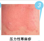 壓力性蕁麻疹:主要表現(xiàn)為皮膚受壓后出現(xiàn)真皮及皮下組織彌漫性水腫及斑塊、境界不清、常累及行走、站立后的足底、久坐后的臀部、提重物或穿緊身衣等受壓處,有自覺瘙癢感、緊繃感、灼痛感或灼熱感,可出現(xiàn)流感樣癥狀。