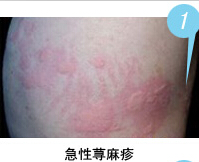 急性蕁麻疹:起病比較急,皮損常突然發(fā)生,為局限性紅色大小不等的風團,覺得劇烈瘙癢、灼熱感。部位不定,可泛發(fā)全身或局限于某部。