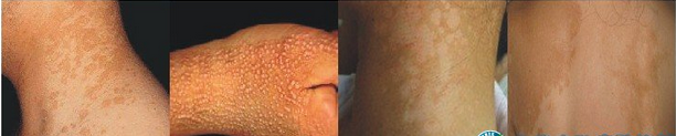 1.花斑型:初起呈淡褐色,表面發(fā)亮,以后出現(xiàn)色素減退。由于新舊皮損混在一起,而呈花斑狀。