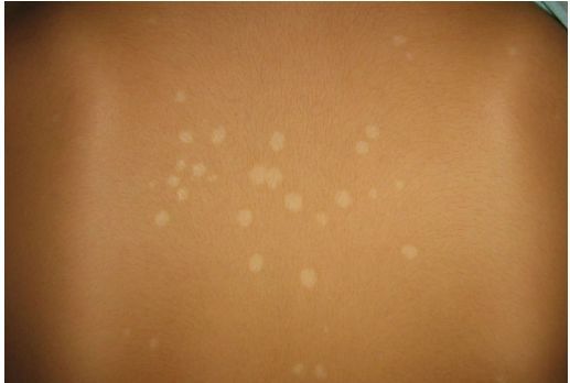 初起損害為圍繞毛孔的圓形點狀斑疹,以后逐漸增至甲蓋大小,邊緣清楚,鄰近損在可相互融合成不規(guī)則大片形,而周圍又有新的斑疹出現(xiàn)。表面附有少量極易剝離的糠秕樣鱗屑,灰色、褐色至黃棕色不等,有時多種顏色共存,狀如花斑。時間較久的呈淺色斑。皮疹無炎性反應,偶有輕度瘙癢感,皮損好發(fā)生于胸背部,也可累及頸、面、腋、腹、肩及上臂等處,一般以青壯年男性多見。病程慢性,冬季皮疹減少或消失,但夏天又可復發(fā)。